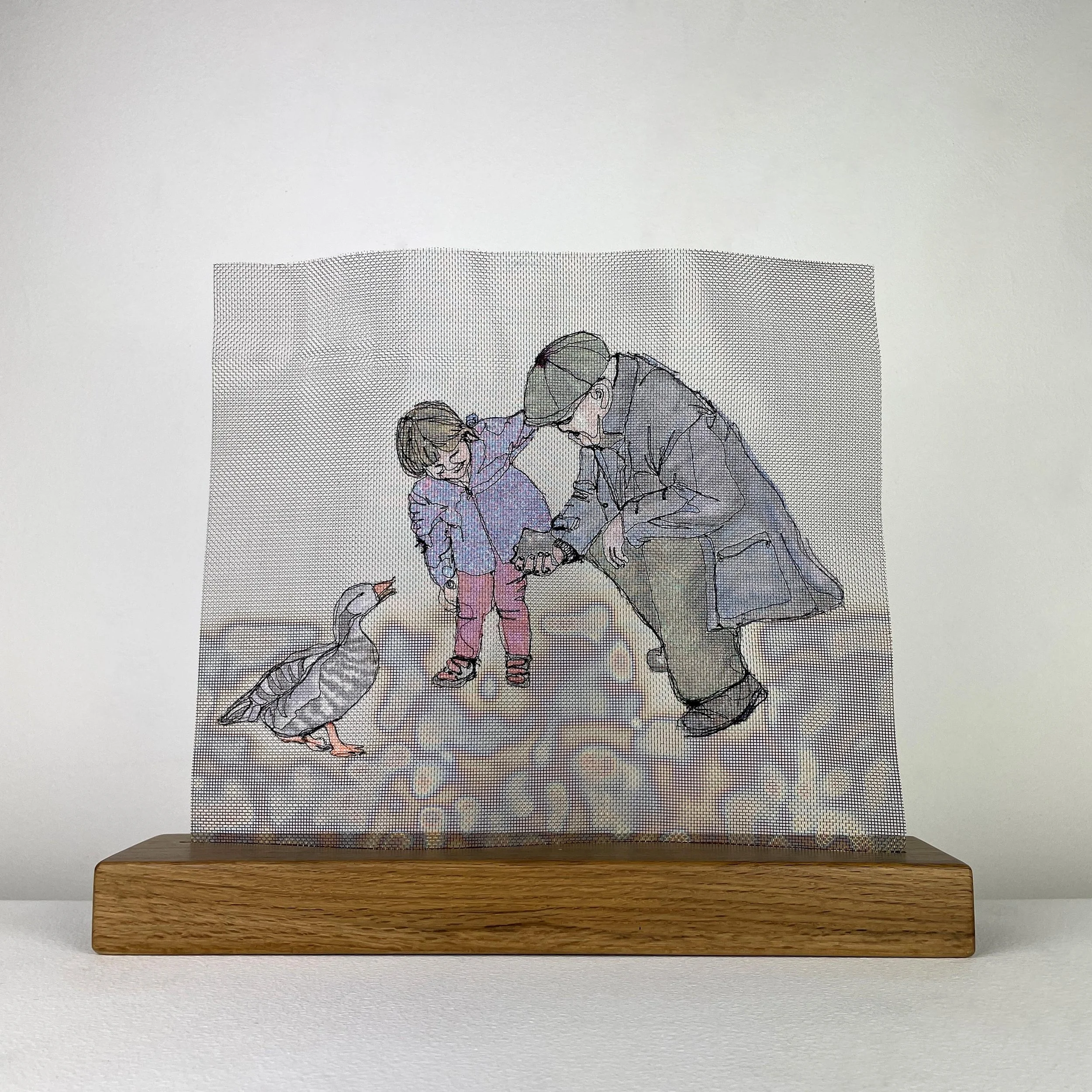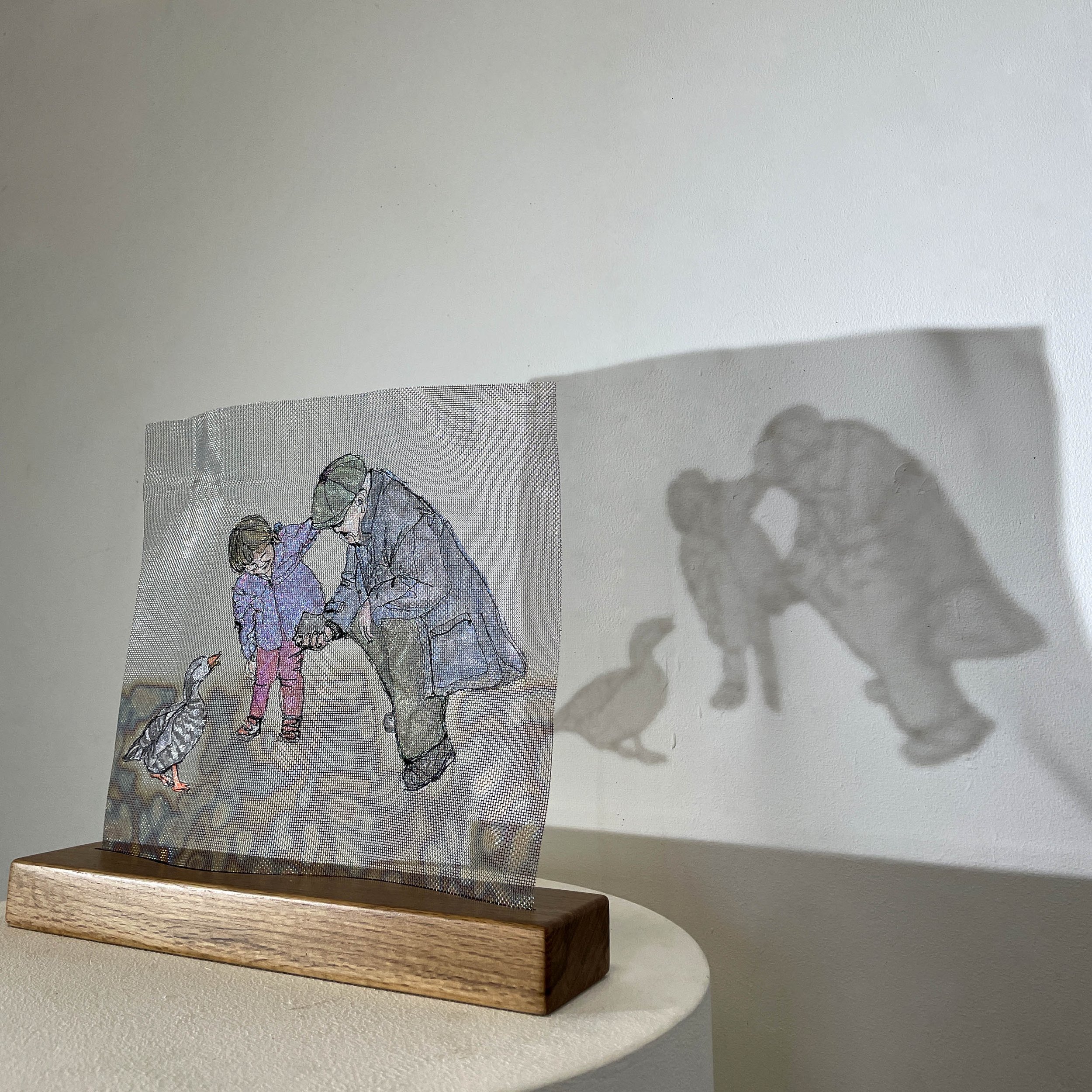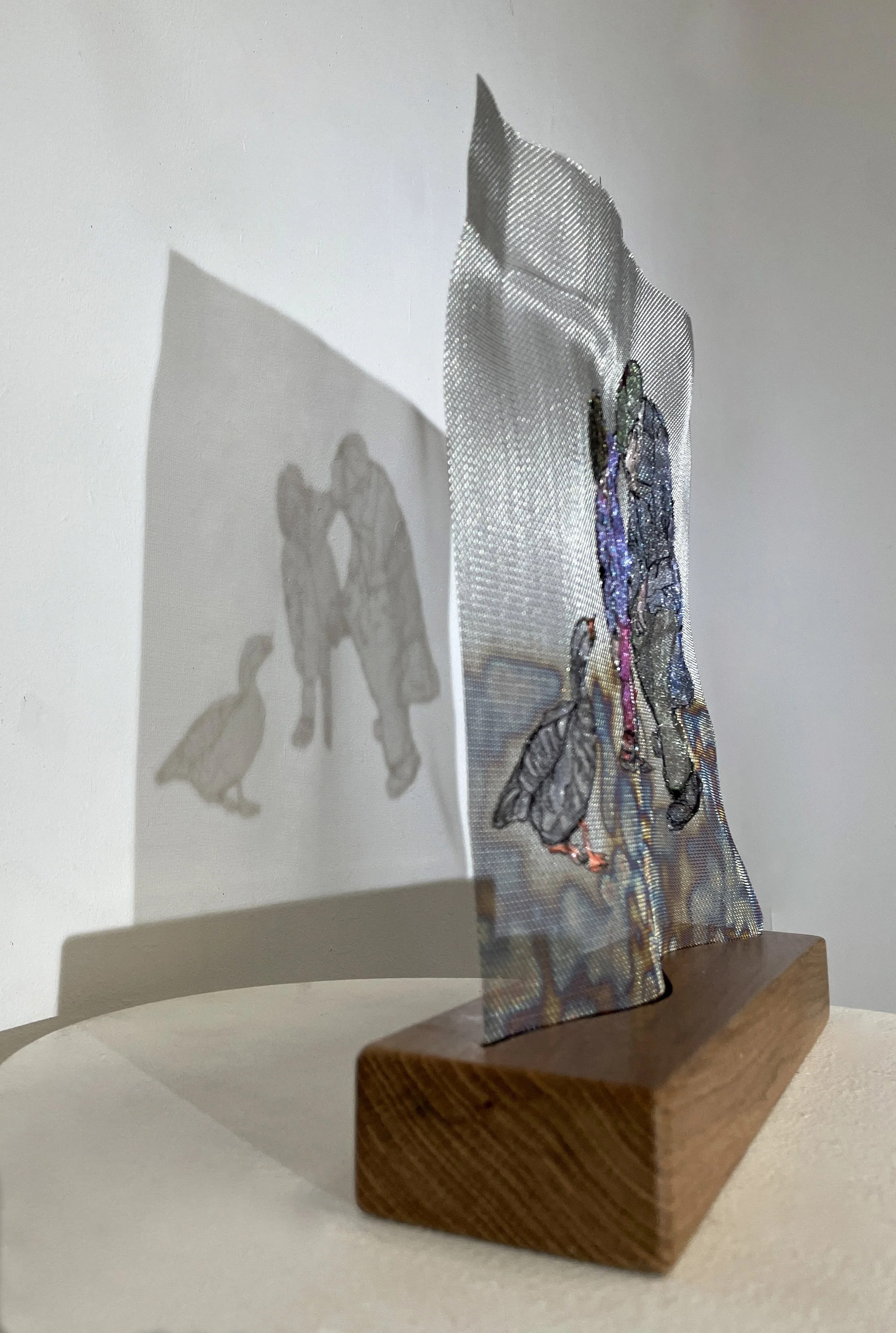 Drawn with black thread on a sewing machine, hand coloured & applied to metal mesh. Mounted onto wooden base.
