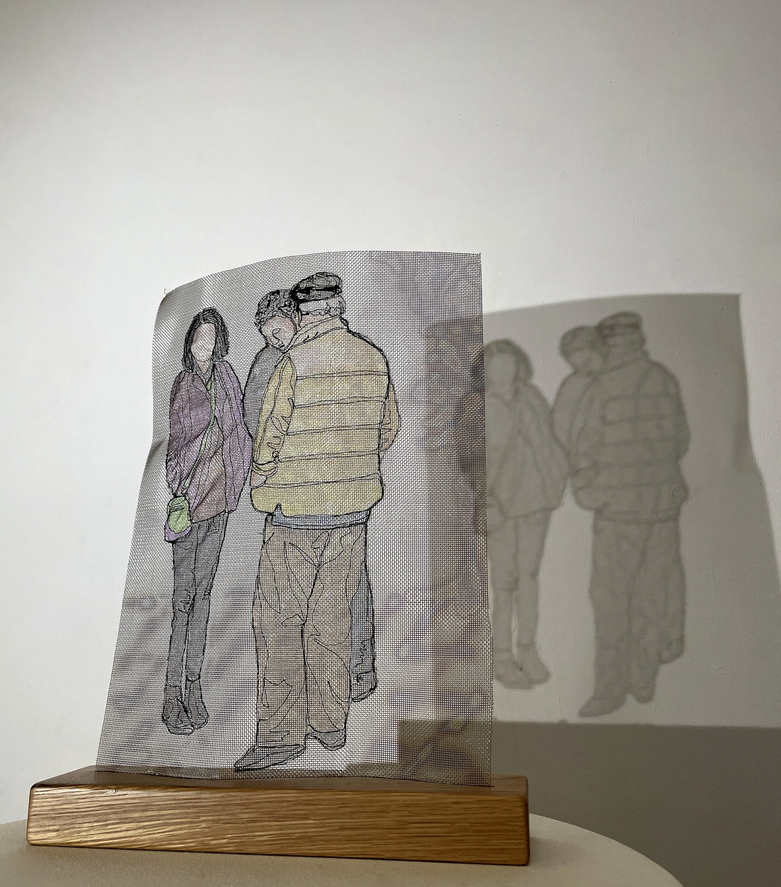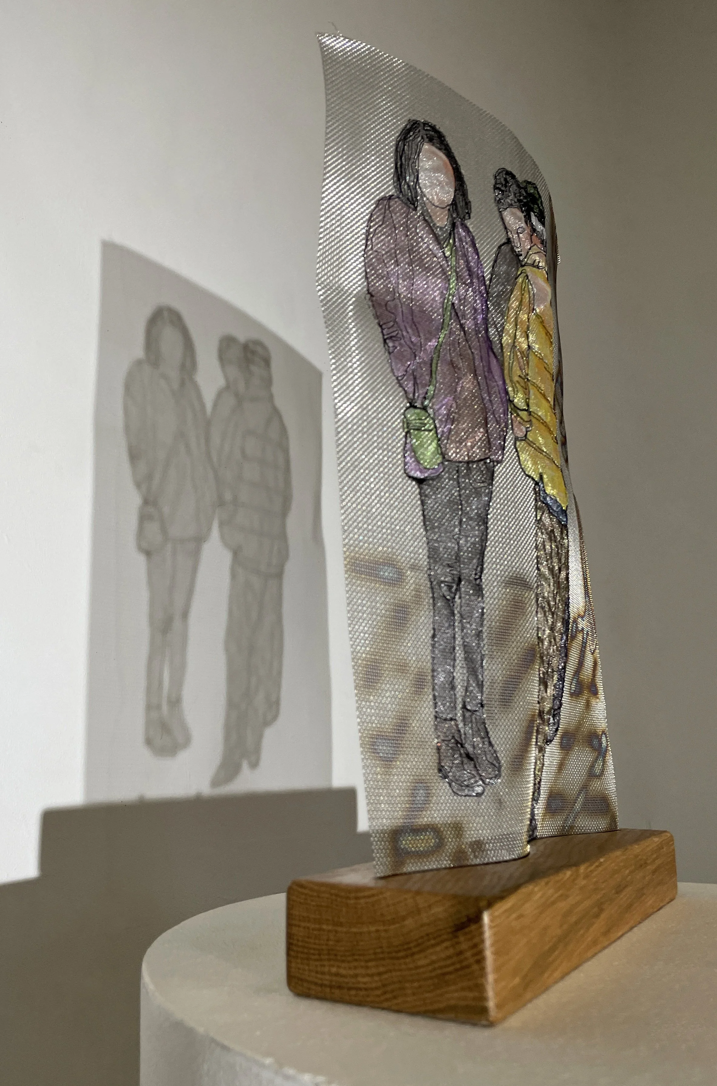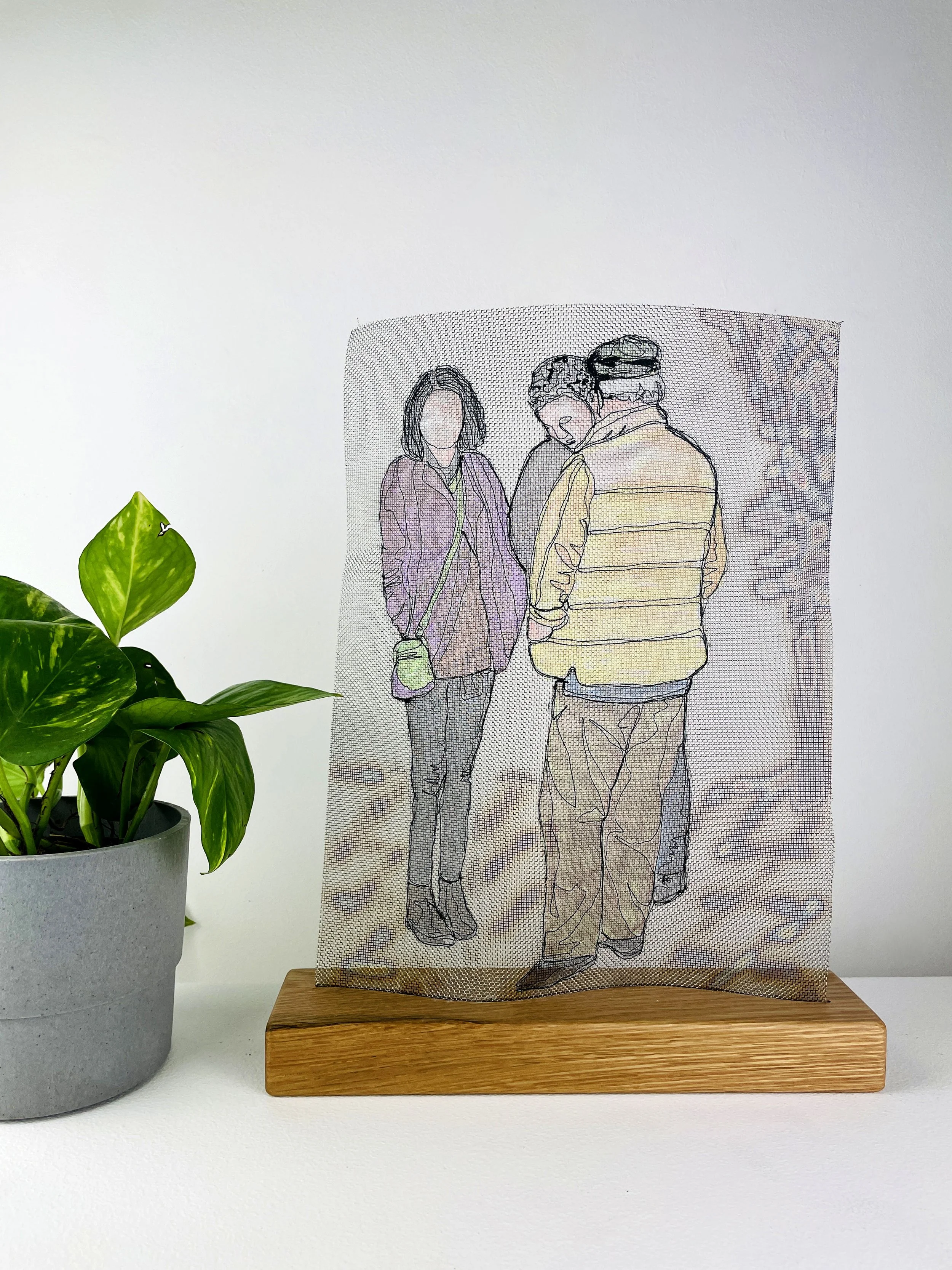 Drawn with black thread on a sewing machine, hand coloured & applied to metal mesh. Mounted onto wooden base.