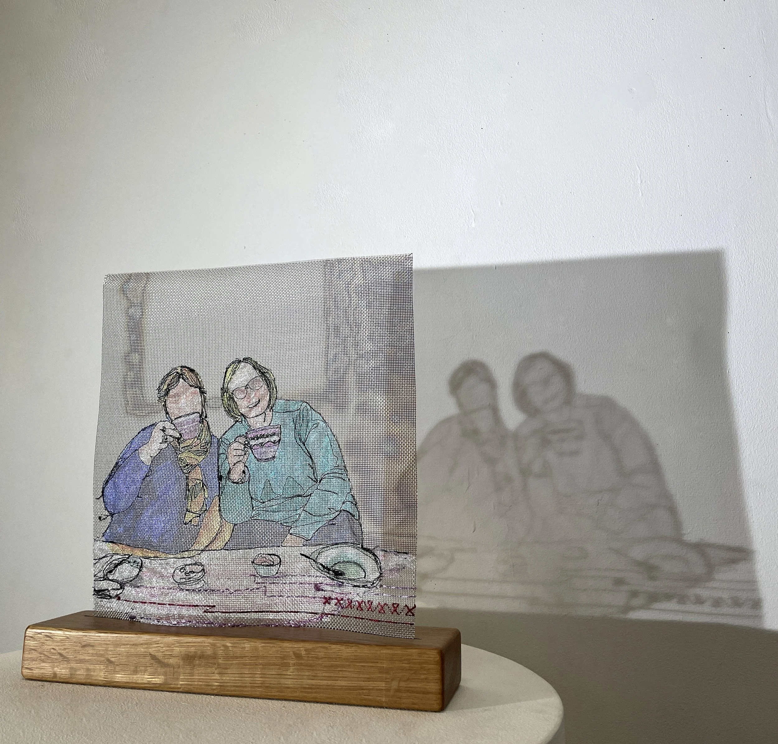 Drawn with black thread on a sewing machine, hand coloured & applied to metal mesh. Mounted onto wooden base.