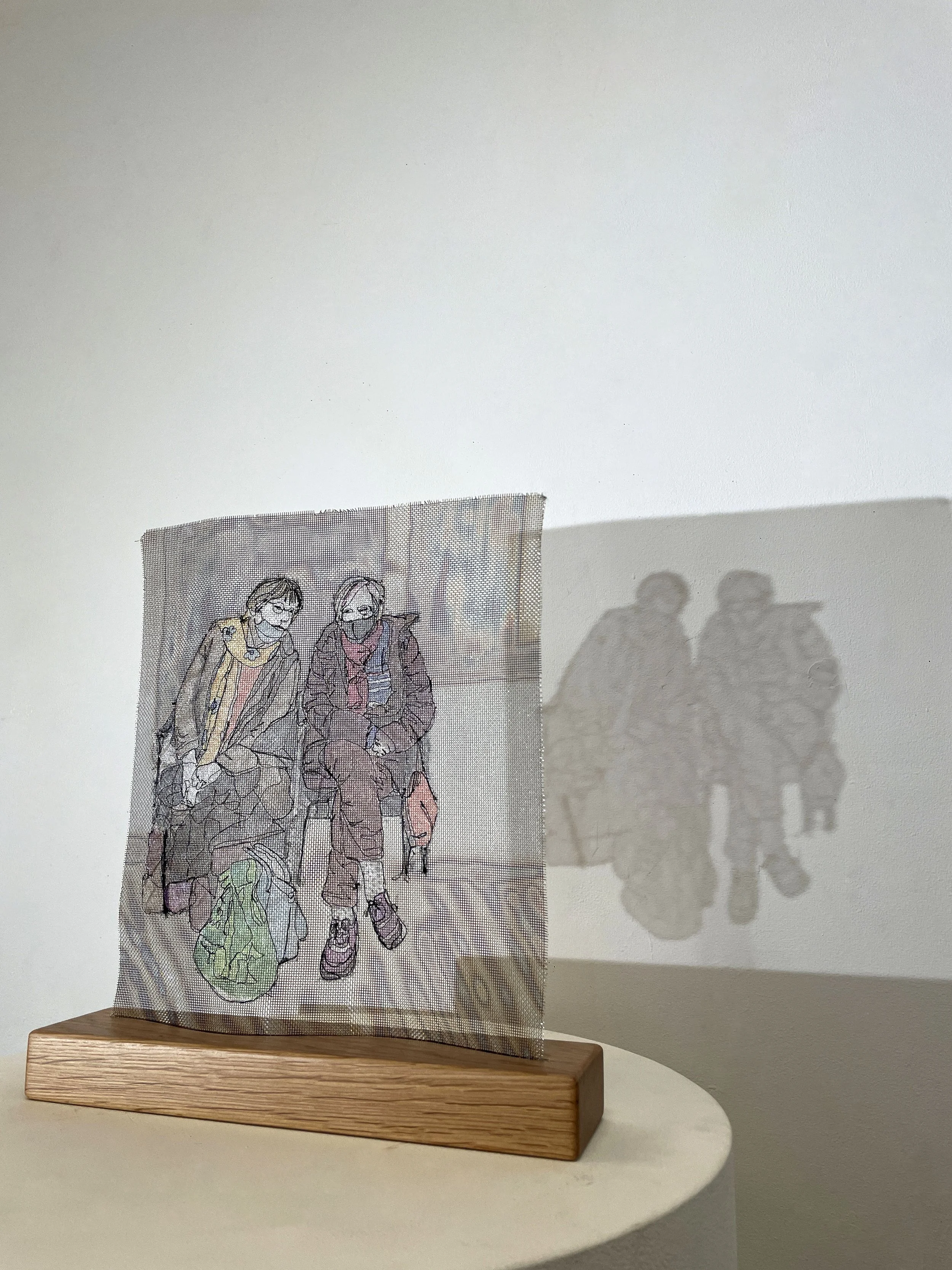 Drawn with black thread on a sewing machine, hand coloured & applied to metal mesh. Mounted onto wooden base.